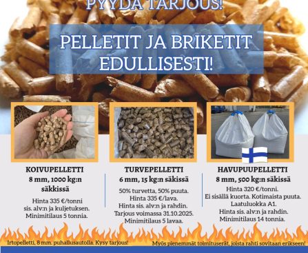 Tuotteiden markkinahinnat vaihtelevat. Hinnat päivitetty 1.9.2025, ovat voimassa toistaiseksi. Kysy päivän hinta! Puupelletin hinta 1.1.2025 alkaen 333 €/tn, sis. alv:n. Tiedote 3.9.2025.Kuljetuskustannusten kohottua emme pysty lupaamaan kuljetusta samaan hintaan kuten aiemmin.Ilmoitamme kuljetuksen hinnan tilauskohtaisesti. Pyydä tarjous!Huom. ennen 3.9.2025 tehdyt tilaukset toimitamme entisillä ehdoilla. Muutos koskee uusia tilauksia. Toimitusaika noin 1-2 vkoa. Toimitamme pienet ja suuret […]